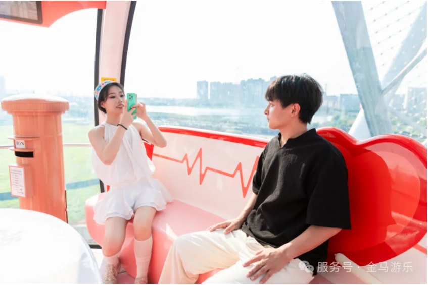 轉(zhuǎn)輪配備36個(gè)面積國(guó)內(nèi)領(lǐng)先的的橢圓形全景“太空艙”轎廂,單艙面積約6平方米,可容納8-10人,滿載可乘坐352人。艙內(nèi)設(shè)有環(huán)形座椅及中央活動(dòng)區(qū),滿足全家同乘的寬敞舒適需求。獨(dú)特的吊掛式橢圓轎廂搭配360°全透明玻璃幕墻,營(yíng)造無(wú)死角全景視野,游客可盡覽景區(qū)及壯闊長(zhǎng)江風(fēng)光,仿佛置身云端,感受城市脈動(dòng)。艙內(nèi)更融合技術(shù)創(chuàng)新與美學(xué)設(shè)計(jì),打造了涵蓋極地、愛(ài)情、童趣等多種風(fēng)格的主題艙,以及驚險(xiǎn)刺激的底部透明艙,支持婚禮、慶生、商務(wù)派對(duì)等主題定制活動(dòng)。此外,艙內(nèi)還配備電子屏實(shí)時(shí)拍照、燈光氛圍調(diào)節(jié)等功能,滿足多元化場(chǎng)景需求。通過(guò)以上創(chuàng)新設(shè)計(jì),成功將“楚天之眼”從傳統(tǒng)的觀景設(shè)施升級(jí)為多功能社交空間,塑造了武漢文旅新地標(biāo)。