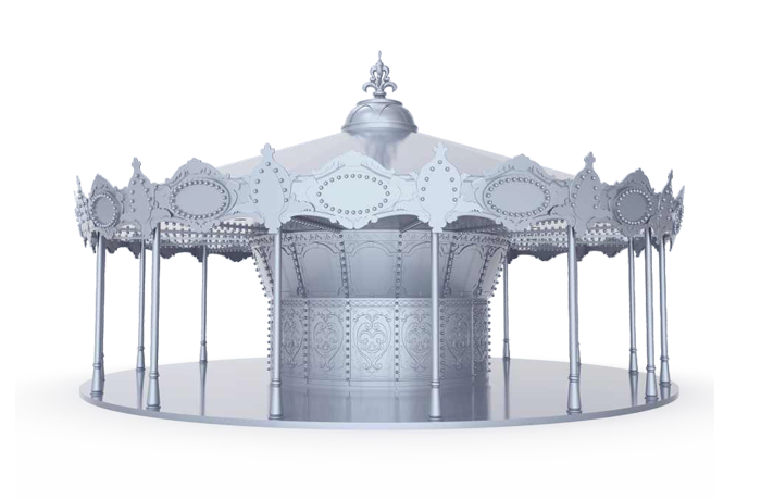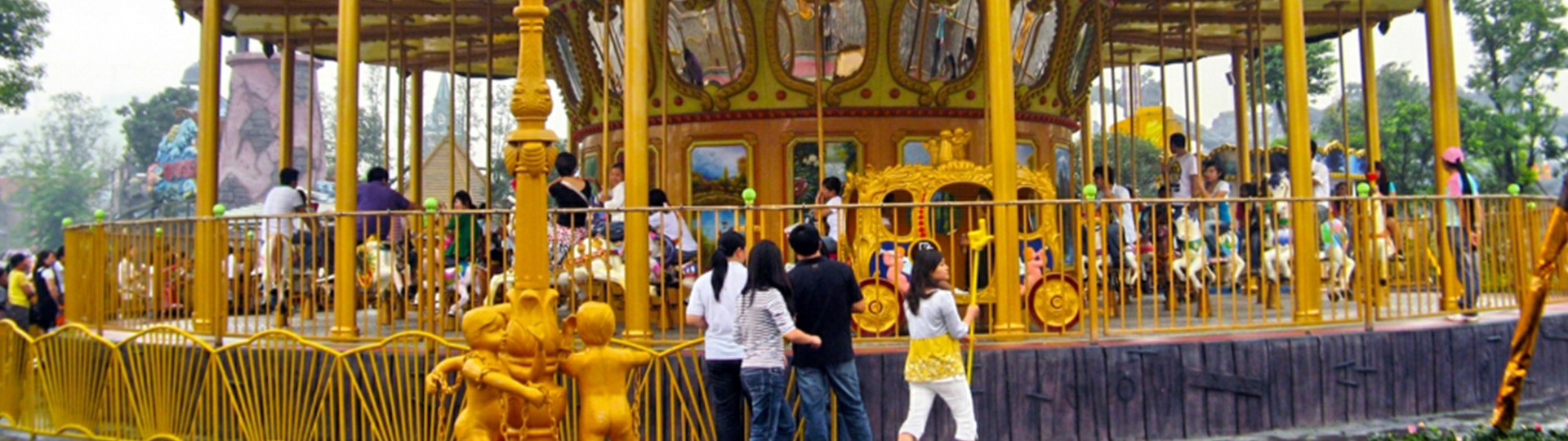 轉(zhuǎn)馬采用動物音樂會裝飾主題,轉(zhuǎn)臺周邊鑲嵌彩色花草圖案,搭配有音樂符號的裝飾花板,并配以變幻的燈彩。轉(zhuǎn)臺上有吹奏彈唱的各類小動物坐騎、造型別致的馬車。游客踏上轉(zhuǎn)馬,猶如踏入了小動物們的狂歡派對之中。