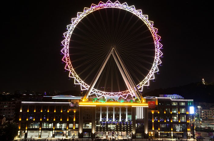 觀覽?是?套?于樓頂經(jīng)歷強(qiáng)臺(tái)?“天鴿”襲擊,仍“巋然不動(dòng)”,安全使?。塔架采?圓管?字?柱結(jié)構(gòu),轉(zhuǎn)盤為輻條式,吊廂懸掛在轉(zhuǎn)盤的外側(cè)?撐架上,造型獨(dú)特新穎,轉(zhuǎn)盤結(jié)構(gòu)通透。達(dá)到?點(diǎn)時(shí),距離地?的?度可達(dá)到108?,將乘客帶到?覽?遺的天空之上,俯視?圓10公?以內(nèi)的景致。