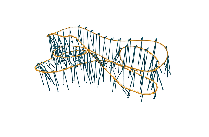 飛行姿態(tài)乘坐式過山車。軌道元素含括急速俯沖飛行、大俯沖飛行、卷餅形倒栽環(huán)、水平環(huán)等,滑行中乘客在軌面仰姿和軌下俯姿兩種姿態(tài)間連續(xù)切換,領(lǐng)略高空翱翔的刺激。與以往的飛行過山車不同,此款飛行過山車車體位于軌道上方,配合水平面上下客平臺,改善了乘客臥姿上下的不適與不便,有效提升舒適度與運營效率。
