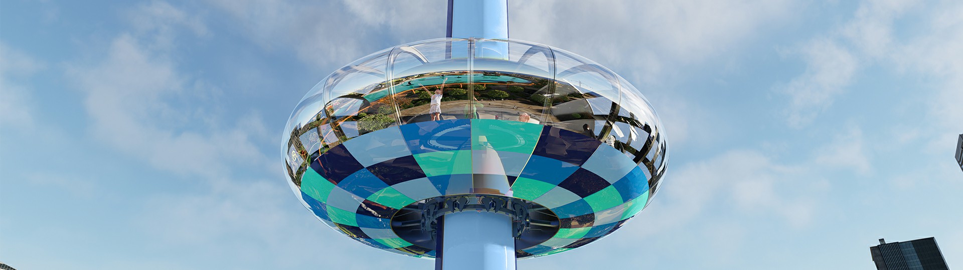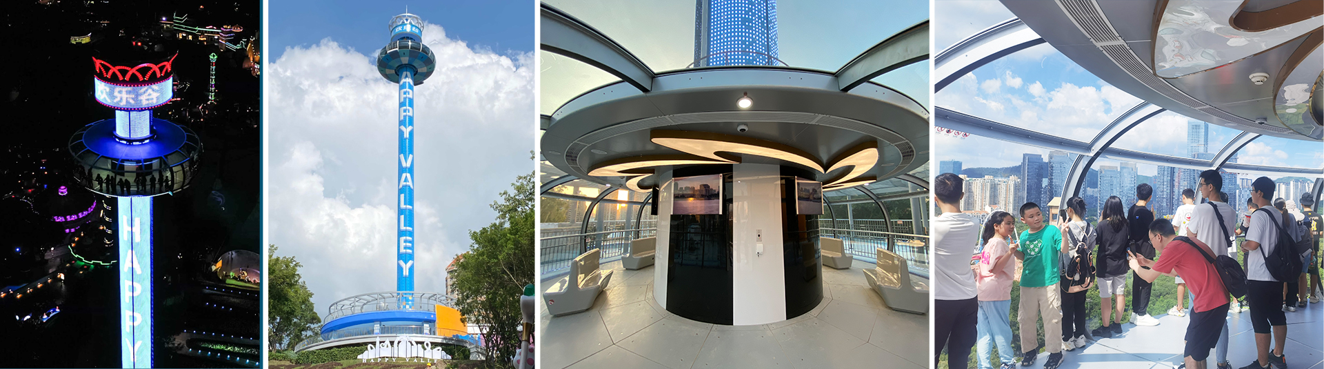 觀景塔擁有可容納100人的“甜甜圈”旋轉(zhuǎn)艙體,載客能力強。雙自動門進(jìn)出口的設(shè)計便于快速上下客,運營高效。乘客在旋轉(zhuǎn)艙中360°環(huán)繞式縱情飽覽四周美景,還可通過艙內(nèi)影音系統(tǒng)感受多元視覺盛宴。夜幕降臨燈光閃耀,璀璨奪目輕易打造夜場焦點,成為聚客地標(biāo)。