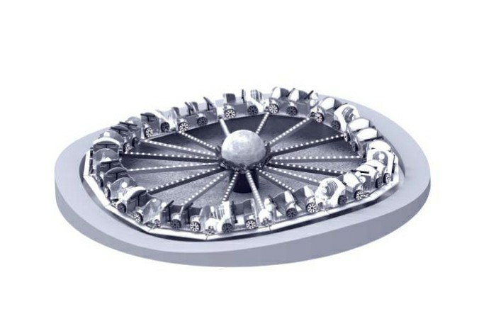 YKC-48B型烈焰戰(zhàn)車,以戰(zhàn)車追逐恒星為主題,中間支撐座裝有回轉支承連接16條轉臂。每條轉臂自帶行走輪,其中四條轉臂帶有驅動裝置,而16個座艙分別安裝在轉臂之間。轉臂行走輪下方布置有環(huán)形的起伏路軌,在轉臂驅動 裝置的驅動下,烈焰車體圍繞中心的恒星高低起伏轉動,座艙隨轉臂旋轉運動 的同時,并沿路軌上下運動,使乘客體驗多重復合旋轉運動帶來的樂趣。