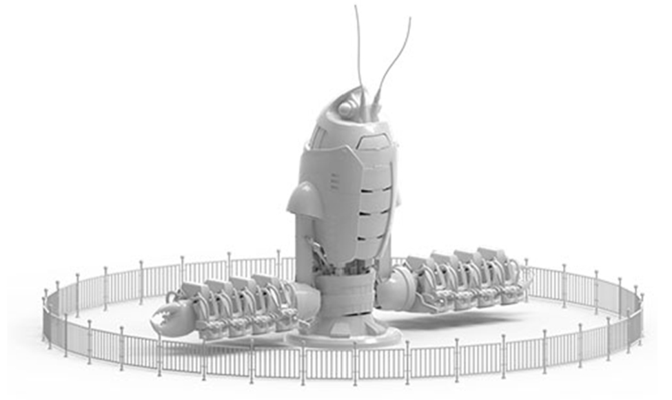 JQJ-16A巨鉗戰(zhàn)甲,設(shè)備結(jié)構(gòu)較新穎,體驗(yàn)感驚險(xiǎn)刺激。開始運(yùn)?時(shí)設(shè)備主體先上升,上升到?定?度后,進(jìn)?公轉(zhuǎn)并伴隨著座艙的?轉(zhuǎn)和升降臂的升降。整體包裝設(shè)計(jì)采?機(jī)械?蝦造型,標(biāo)志性的?蝦紅配?加上煙霧、燈光的效果,帶給游客歡樂(lè)、刺激的體驗(yàn)。