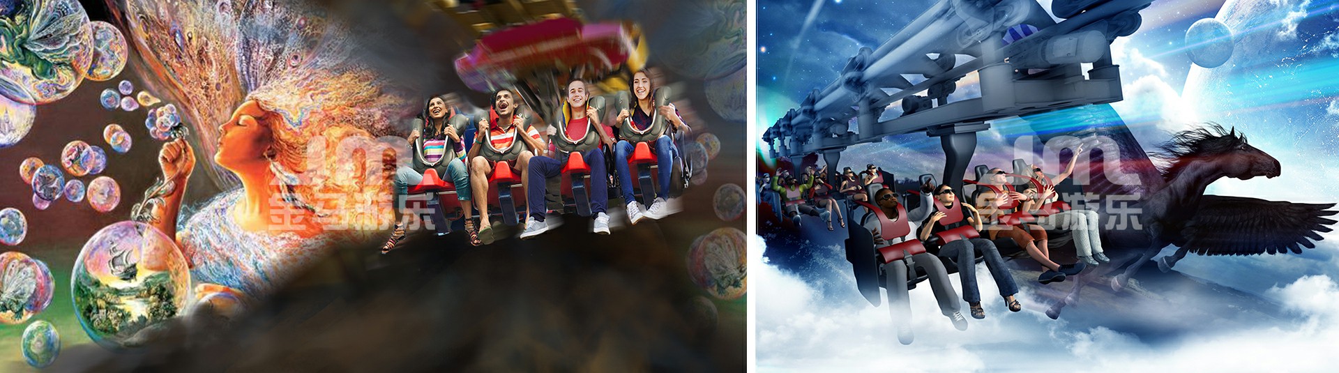 自帶動力的懸掛式過山車實現了在軌道任意位置變換速度,時速可高達32km/h,在高清電影、科技特效的影視相融合下,使乘客完全沉浸在游戲的樂趣和刺激中